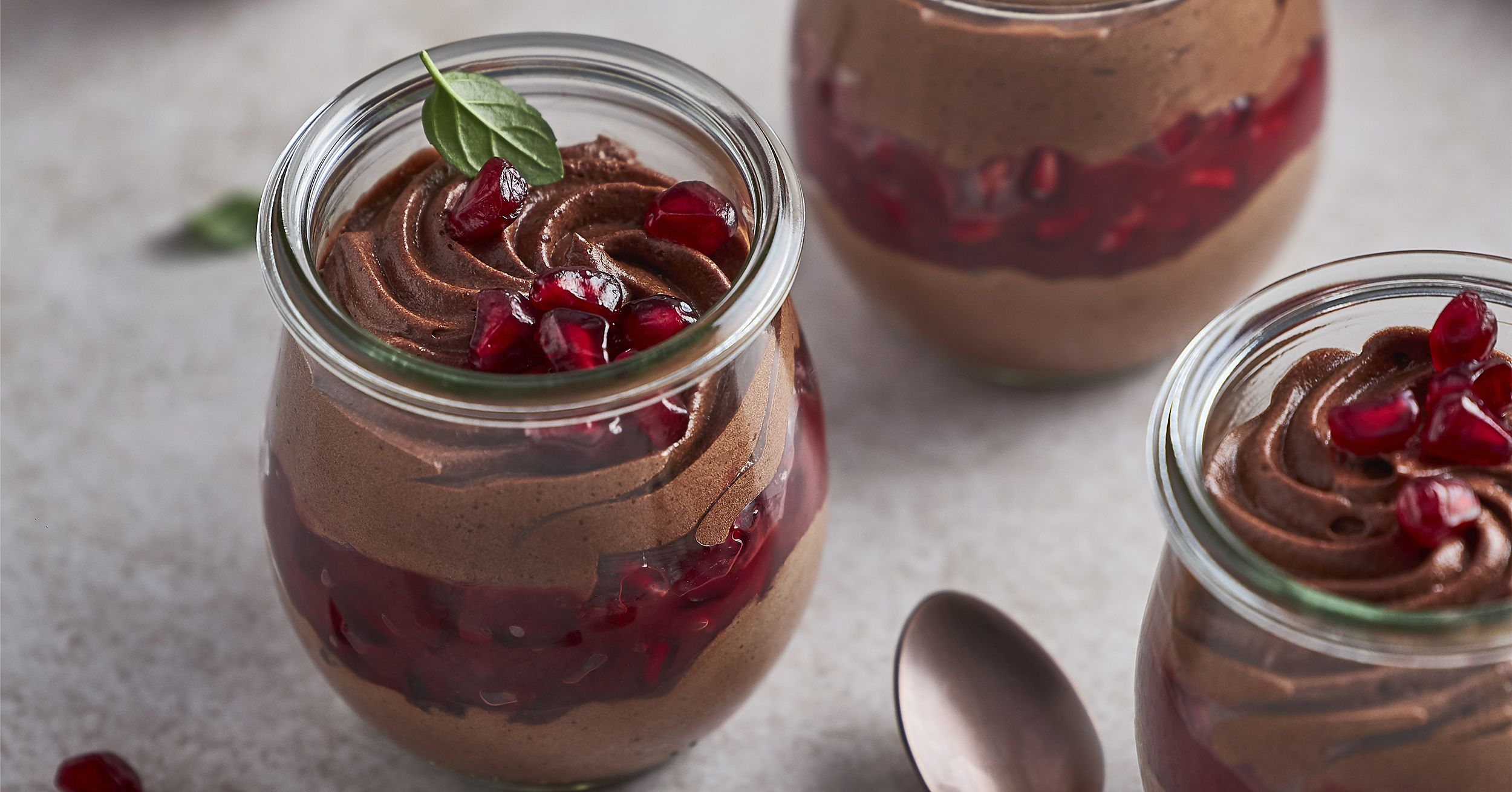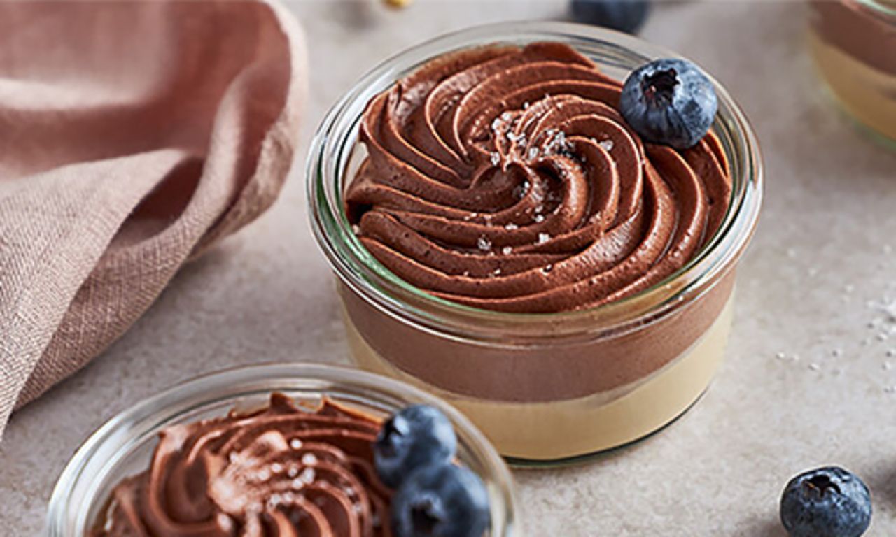 Prøv vores lækre veganske mousse au chocolat med saltet karamel, som er lavet med vores nye koldrørte Veganske chokolademousse.